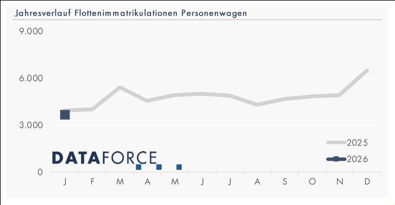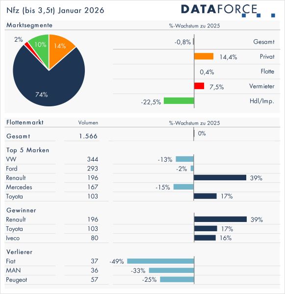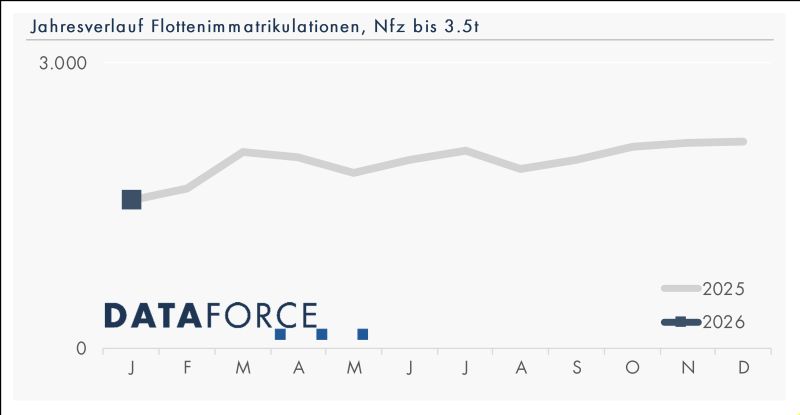 Im Markt für leichte Nutzfahrzeuge bis 3,5 Tonnen zeigte sich 2025 ein Rückgang von 8,2 Prozent, wobei der Flottenbereich um 7,2 Prozent schrumpfte. Die Vermieter reduzierten ihre Immatrikulationen sogar um 31 Prozent. Im Januar 2026 stabilisierte sich das Volumen nahezu auf Vorjahresniveau. Auffällig war der Aufschwung von Renault im Flottengeschäft mit einem Plus von 39 Prozent, getragen von den Modellen Renault Trafic und Renault Master. Auch Maxus setzte mit 54 Zulassungen ein Zeichen. Trotz eines Rückgangs behauptete sich Volkswagen Nutzfahrzeuge dank eines starken Volkswagen Transporter an der Modellspitze. Die Elektrifizierung bleibt im Nutzfahrzeugmarkt jedoch verhalten: Der Elektroanteil stagnierte bei rund 11 Prozent, während Diesel mit 82 Prozent weiterhin dominiert. Für Fuhrparkbetreiber stehen unverändert die Gesamtbetriebskosten im Vordergrund – erst mit sinkenden Anschaffungspreisen dürfte die Nachfrage nach Elektrotransportern spürbar anziehen.