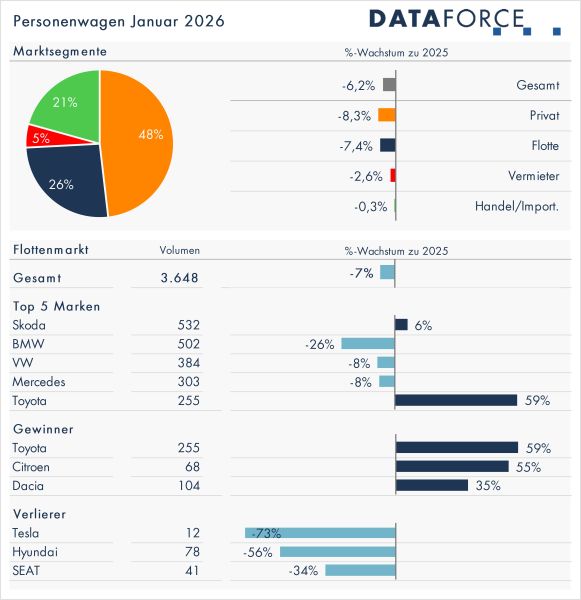 Auf Jahressicht schlossen die Flottenimmatrikulationen 2025 mit einem Minus von 4,8 Prozent und entwickelten sich damit etwas schwächer als der Gesamtmarkt mit minus 2,5 Prozent. Deutlich unter Druck standen Diesel-Personenwagen mit einem Rückgang von 21 Prozent, während Plug-in-Hybride um 18 Prozent zulegten. Reine Elektrofahrzeuge wuchsen im Flottenbereich zwar um 8 Prozent, konnten jedoch den stärkeren Rückgang bei Benzinern von 7 Prozent volumenmässig nicht kompensieren. Zu den wichtigsten Importeuren zählten weiterhin Škoda Auto, BMW und Volkswagen. Während Škoda und BMW jeweils 9 Prozent verloren, legte Volkswagen um 3 Prozent zu. Als klarer Gewinner im Flottenmarkt erwies sich Toyota mit einem Plus von 13 Prozent, getragen insbesondere vom Toyota Corolla, dessen Flottenimmatrikulationen sich mehr als verdoppelten.