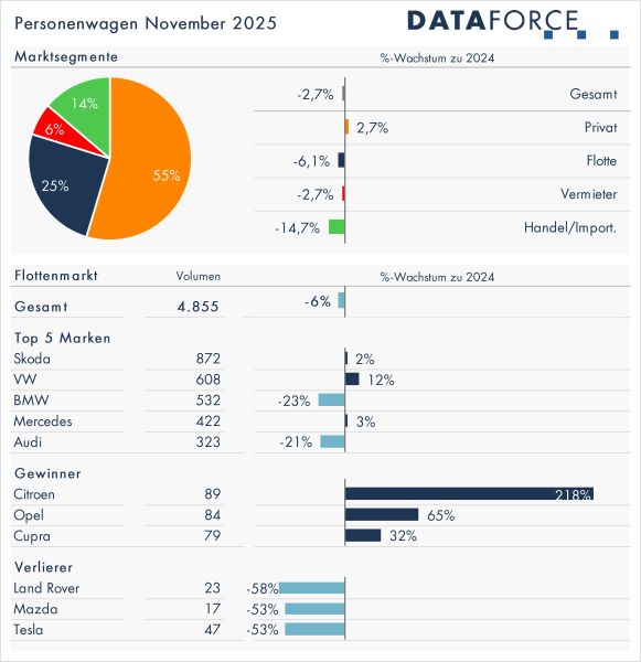Für 2026 sind keine grossen wirtschaftlichen Impulse zu erwarten. Die sehr niedrige Inflation und günstige Zinsen stehen einer Stagnation bei den Exporten gegenüber. Jedoch wird sich der Markt besser als 2025 an die strengeren CO2-Ziele und die Automobilsteuer für E-Fahrzeuge anpassen. Anders als im Übergang 2024/25 gibt es auch keine vorgezogenen Käufe, die die Bilanz des Folgejahres belasten. Daher erwartet Dataforce ein leichtes Marktwachstum von etwa 3 Prozent auf 240‘000 Pkw. Bei den Firmenwagen werden die neuen, reichweitenstärkeren Elektromodelle den Absatz ankurbeln, so dass sich das Marktvolumen leicht auf 60‘000 verbessert.