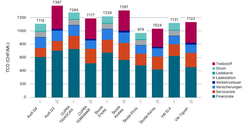 *Berechnung der Gesamtkosten (TCO) pro Monat: Audi Q3 CHF 1367.–, Audi Q4 e-tron CHF 1019.–. Das entspricht einer Kostenersparnis von 26% – je nach Nutzung und Tarif sind bis zu 30% möglich.