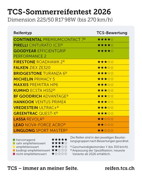 TCS Sommerreifentest: Budgetreifen bilden das Schlusslicht in der Tabelle